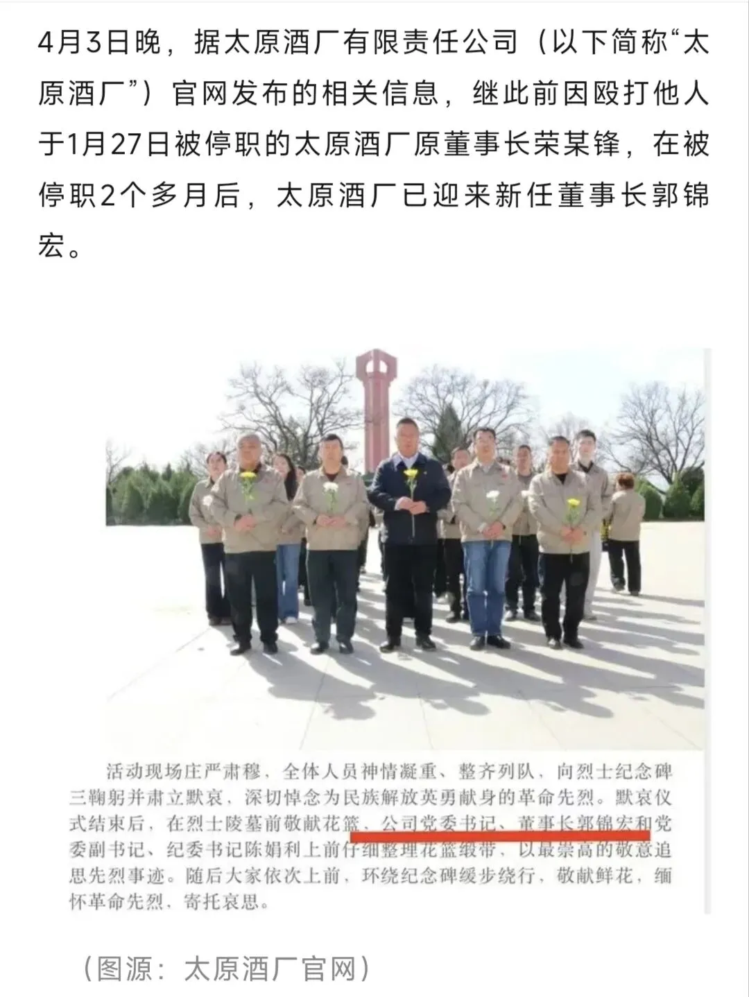 今年的1月27日,太原市国资委发布情况通报称,经初步核查,荣某锋确因企业货款纠纷与他人发生冲突,其间存在殴打他人行为,依据相关法律法规及纪律规定,决定对涉事企业负责人荣某锋停职,后续将根据调查结果,依规依纪依法严肃追责问责,以及立即责成驻委纪检监察组会同公安部门开展专项调查等。如今,太原酒厂董事长换帅,说明太原纪委已就荣某锋打人一事,进行了严肃追责问责。荣某锋在太原酒厂的位置上,已经彻底告别其曾经身居的管理岗位。