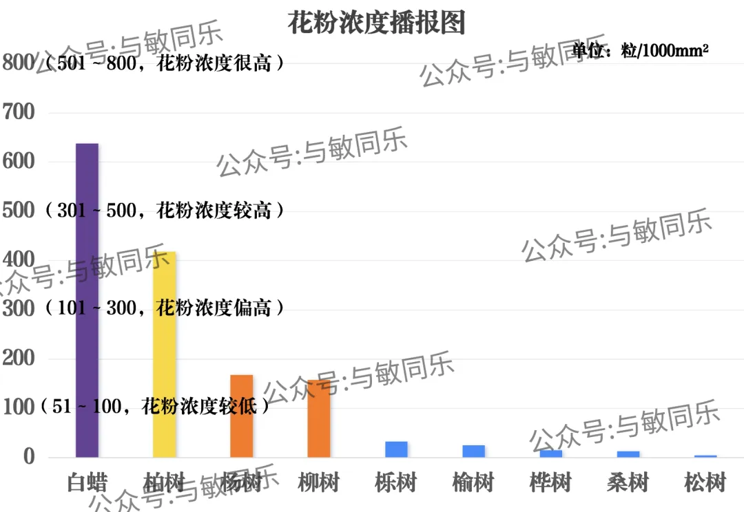 栎树、榆树、桦树、桑树、松树花粉浓度为很低。