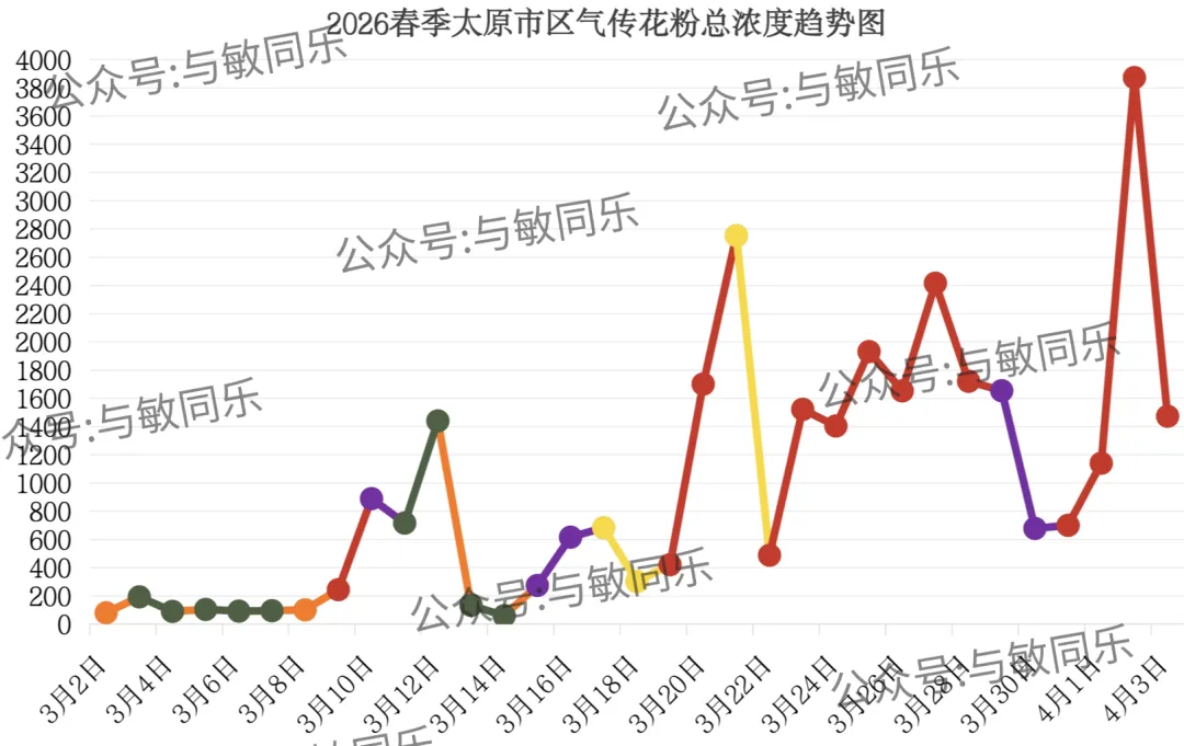 4月3日早8点至4月4日早8点:花粉总数≥801(粒/1000mm²),花粉总浓度为六级(花粉浓度极高)。