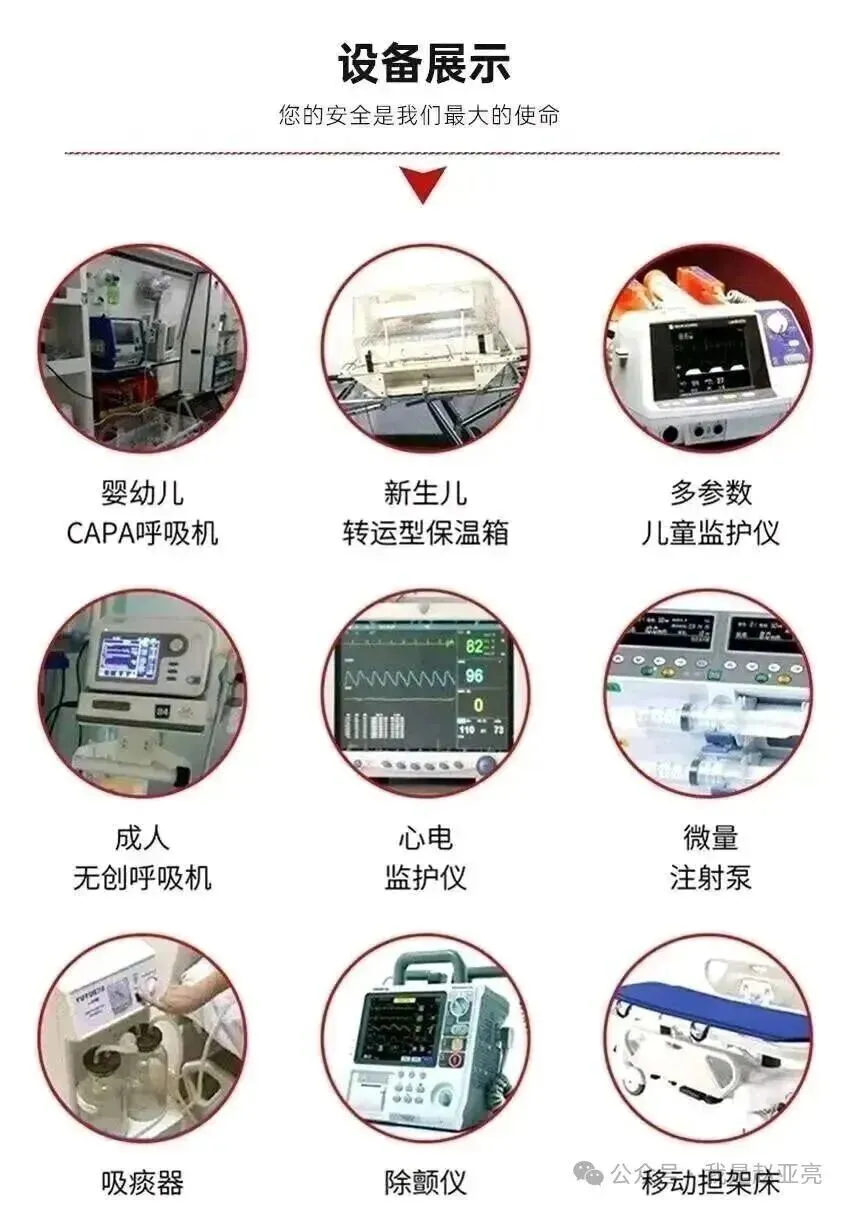 车辆配备呼吸机、多参数监护仪、供氧与吸引系统等基础急救设备,并定期维护消毒。