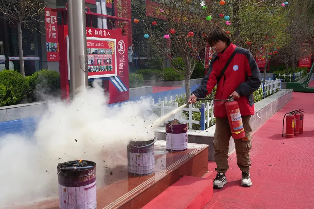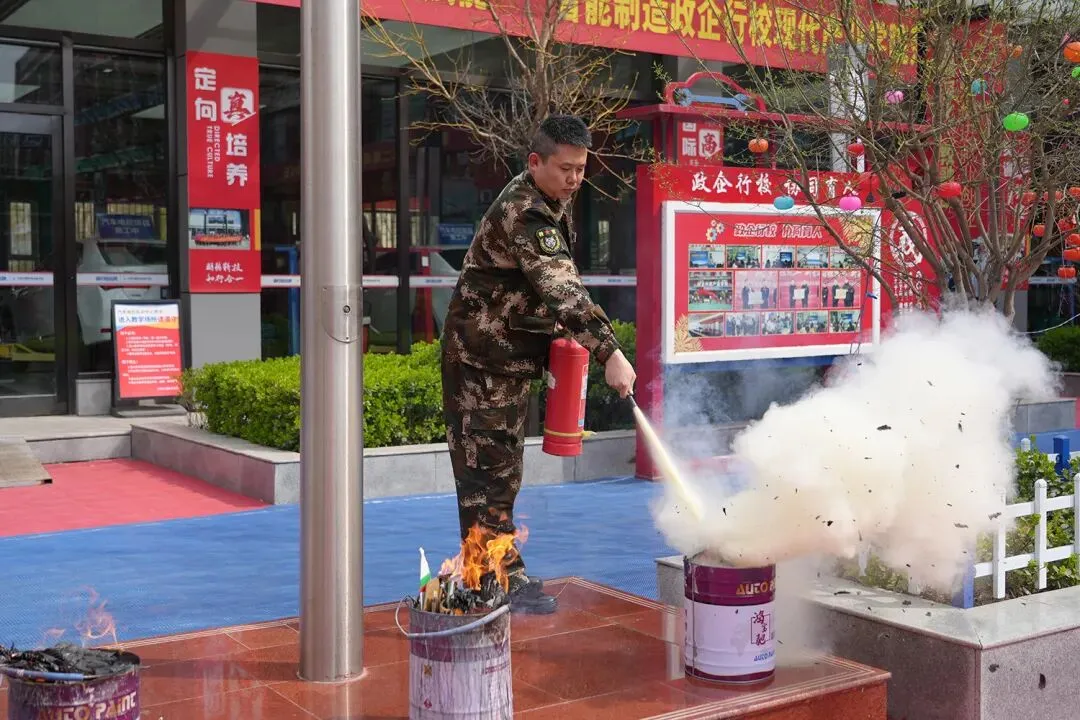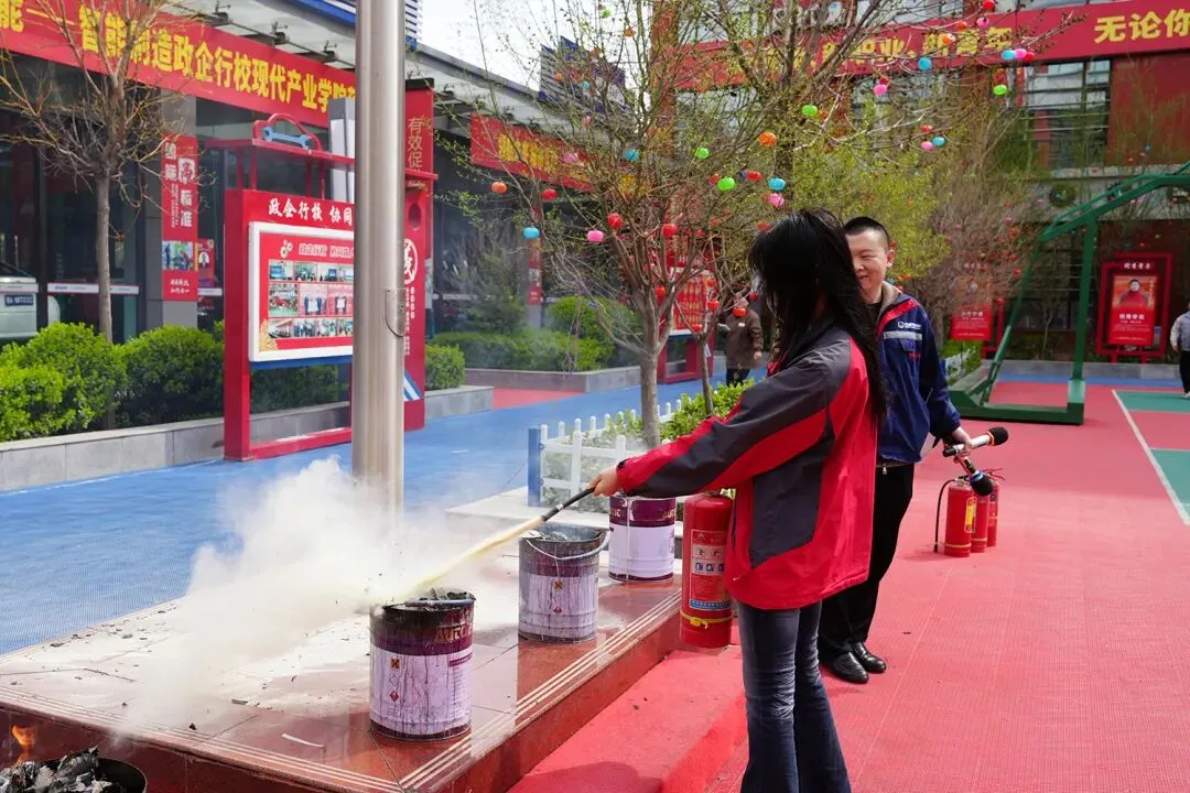 疏散环节结束后,学校殷教官为师生们进行了灭火器使用知识的现场讲解。他结合校园常见火灾类型,详细介绍了干粉灭火器的结构原理、适用范围及“提、拔、握、压”的操作要领,并现场进行规范演示。随后,部分师生代表在教官指导下,依次上前进行灭火实操,亲身体验灭火器的使用过程。