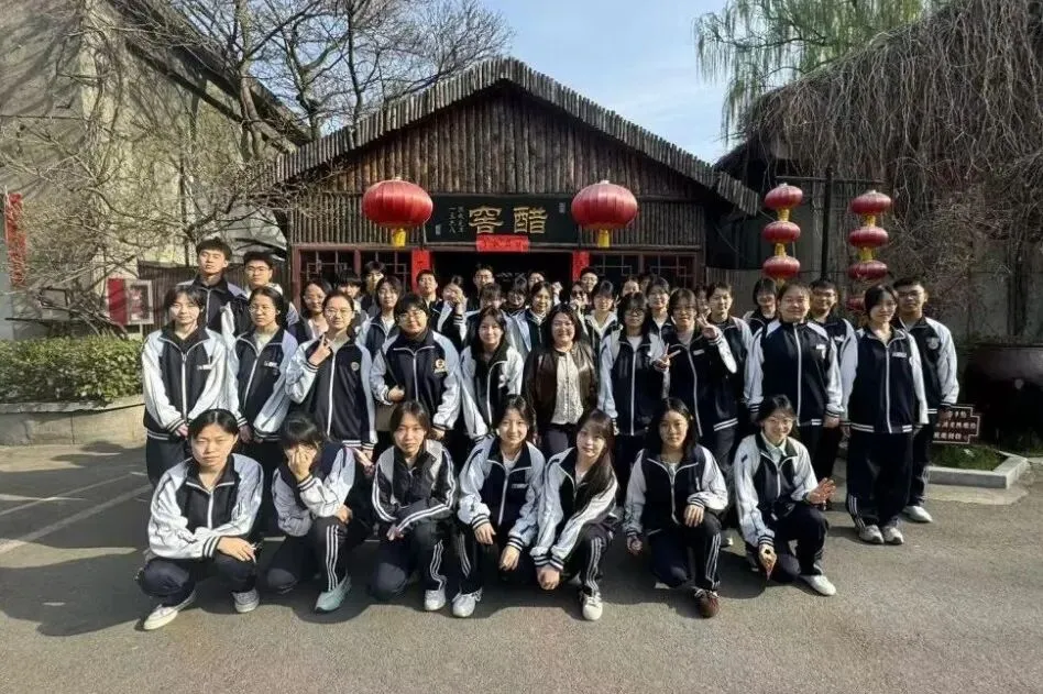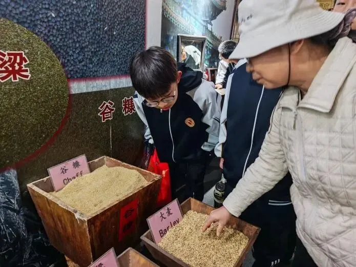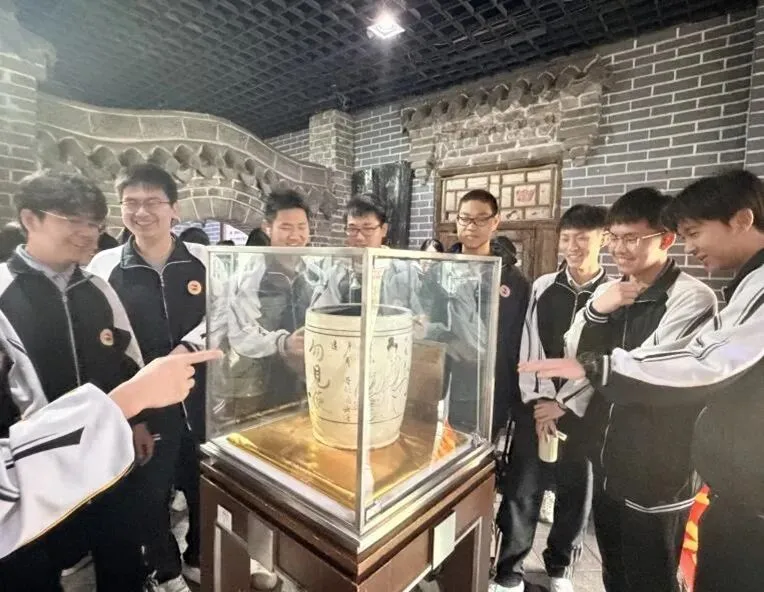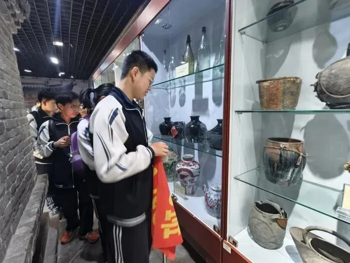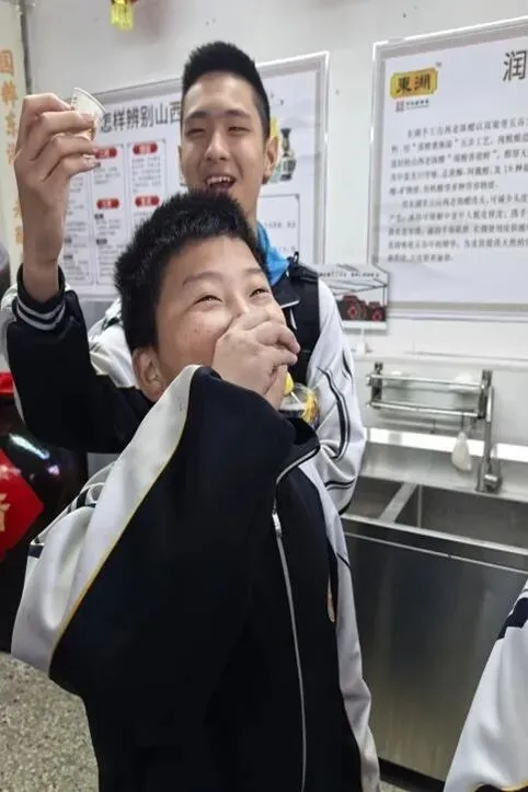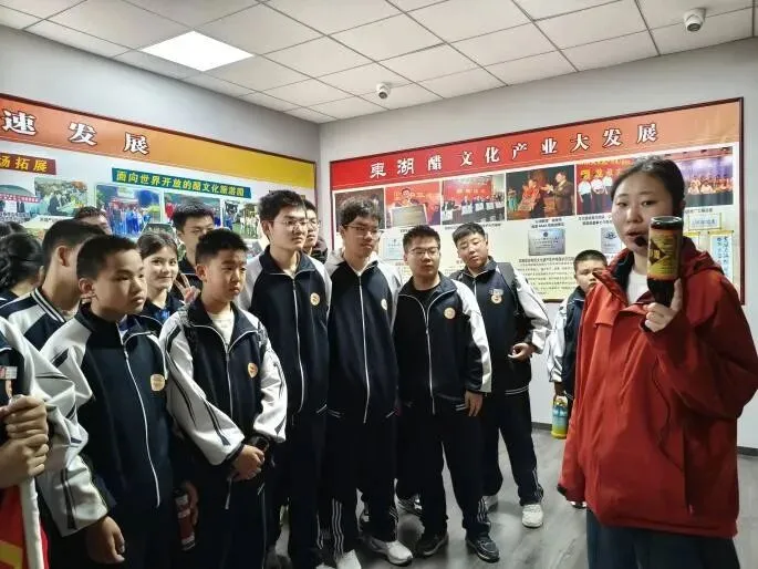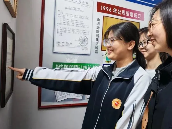 第一站,师生们来到了位于太原东山脚下的东湖醋园。一踏入醋园,迎面而来的便是酸中带醇、沁人心脾的老陈醋香气。在讲解老师的带领下,师生们近距离观摩“蒸、酵、熏、淋、陈”的古法酿醋流程,亲手触摸那些历经岁月的酿醋器具,了解老陈醋从高粱到一滴醋的神奇蜕变,身临其境地感受山西老陈醋六百年的历史传承,切身体会山西醋文化的深厚底蕴与匠心精神。