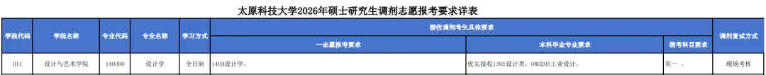 根据教育部《2026年全国硕士研究生招生工作管理规定》、《关于做好2026年全国硕士研究生复试录取工作的通知》及山西省招生考试管理中心《关于做好我省2026年硕士研究生复试录取工作的通知》等文件及相关会议精神,结合学校一志愿考生复试情况和专业招生计划,我校部分专业预计接收调剂生。调剂信息请查询中国研究生招生信息网调剂系统,并及时关注我校相关信息的发布。一、调剂专业 我校一志愿复试拟录取人数未达到招生计划数的专业,均接受调剂考生。二、调剂分数线 调剂复试工作将根据调剂考生报名情况按照“分批通知、择优复试录取”的原则进行。 接收退役大学生士兵专项调剂的专业报名条件为网上报名系统中申请享受退役大学生专项计划并通过审核的考生。退役大学生士兵专项计划均执行教育部划定的“享受少数民族照顾政策的考生”分数线。 首批接受调剂的各专业考生报名分数线均为教育部划定的A类考生分数线,后续批次报名分数线根据前期批次复试人数和拟录取情况确定。学校将在各批次调剂报名工作结束后,根据复试比例,及时公布各专业调剂考生进入复试的分数线。三、调剂基本要求 (一)达到第一志愿报考专业及调入专业的A类考生分数线,且符合学校审议通过的调入专业对报考专业和本科毕业专业的要求。 (二)调入专业与第一志愿报考专业相同或相近,原则上应在同一学科门类范围内;对于可授予两个以上不同学科门类学位的专业,可互相调剂(如077500计算机科学与技术、081200计算机科学与技术可互相调剂)。 (三)考生初试科目与调入专业初试科目相同或相近。 (四)考生在照顾专业与非照顾专业之间调剂,其初试成绩均须符合A类地区第一志愿报考专业所在学科门类的非照顾专业国家分数线。考生在工学照顾专业之间调剂,按照顾专业国家分数线执行。 (五)各专业均不接受同等学力考生调剂申请。 (六)部分专业接收退役大学生士兵专项调剂,具体请查阅研招网调剂服务系统。四、调剂名额 学校将通过研招网的调剂服务系统按学院、专业公布调剂名额,由于受考生调剂报名、接受复试通知、复试报到率等不确定因素影响,学校将根据实际情况对调剂名额进行调整并更新相关信息,请及时关注。五、调剂流程 (一)拟申请调剂我校的考生需按照我校公布的调剂要求(具体专业要求见附件1),在规定时间内用任一调剂志愿填报我校,考生调剂信息以研招网上考生填报内容为准。填报调剂志愿时,请认真查看调剂公告、招生目录等内容。 (二)考生调剂报名时间:4月8日00:00-14:00(对于调剂报名不足的专业将适当延长调剂考生报名时间至17:00);学校发送复试通知时间为4月8日22:00前,最晚不迟于4月9日上午10:00。如有变动将在研究生学院网站另行通知。 (三)学校将根据已填报调剂志愿考生的本科毕业专业、初试科目、初试成绩(单科、总分)、一志愿报考专业等条件对考生进行择优遴选,确定调剂考生复试名单。 (四)接到复试通知的考生须按通知内容要求,在规定时间内(一般不超过4小时,具体要求以复试通知内容为准)接受复试通知,我校只对已同意参加复试的考生安排复试。未在规定时间内接受复试通知的,我校有权取消该复试通知。 (五)考生填报调剂志愿及接受复试通知前请认真考虑,原则上我校不再接受“已接受复试通知但未参加复试”考生再次填报的同一专业的调剂申请。 (六)考生调剂志愿解锁 1.考生调剂志愿锁定时间为24小时,24小时后考生可自行选择是否修改志愿。 ⑴如考生在我校发送复试通知前修改了调剂志愿,学校将无法发送复试通知。 ⑵如考生在填报调剂志愿后24小时内确需申请解锁调剂志愿,请准备好本人的准考证后致电我校研究生学院招生办(0351-6991156)。 ⑶对于本科毕业专业不符合调剂要求的考生,我校将对该调剂志愿进行解锁。 2.考虑考生接受复试通知及实际报到率等因素,对于调剂生源充足的专业,我校原则上按照调剂名额的2倍发送复试通知。 3.考生在接受复试通知前请务必认真考虑,接受复试通知后,学校无法对调剂志愿进行解锁。 (七)资格审查 我校通过调剂系统发送复试通知后,“接受复试通知”的考生应携带以下材料,在规定时间内到指定地点报到(具体时间、地点另行通知)。 1.初试准考证(可在中国研究生招生信息网下载)、身份证原件; 2.《太原科技大学2026年硕士研究生诚信复试承诺书》(附件2,须打印后认真阅读并签字确认); 3.报考“退役大学生士兵”专项计划的考生须携带身份证、学籍或学历在线验证报告、《入伍批准书》、《退出现役证》复印件并交于复试学院; 4.复试缴费凭证复印件。 5.考生还可提供本科期间的学习成绩、课程设计、毕业论文、科研成果或工作业绩等材料。六、缴费 缴费系统开放时间为4月9日09:00-16:00,如有变动将在研究生学院网站另行通知。按以下方式交纳复试费(120元/人)。我校对已缴纳复试费的考生安排复试。缴费后因本人原因导致取消复试资格或不能参加复试的,学校不退还已缴纳的复试费。 缴费方式:微信-太原科技大学服务号-缴费服务-临时缴费;根据提示,输入姓名、考生编号即可缴费。 说明:微信缴费失败或者出现空白页无法操作,请使用微信直接搜索校园安心付公众号反馈问题在线解决,也可以拨打客服电话咨询处理:4000281024。七、复试主