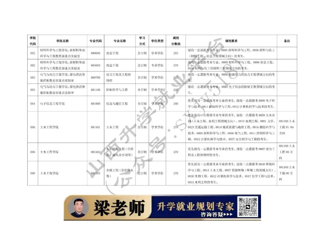 有关需接收调剂的专业、调剂分数线及要求、调剂工作程序、调剂具体时间等内容将在一志愿复试录取工作结束后,在太原理工大学研究生院网站和有关学院网站发布通知公告。