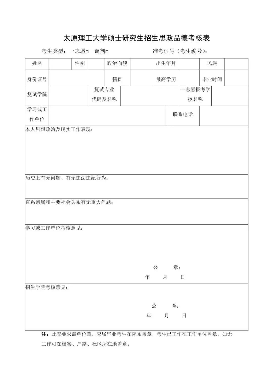 参加复试的考生须将完成审查并盖章的《太原理工大学硕士研究生招生思政品德考核表》(附件1)在复试时交学院复试小组。填报注意事项如下:
