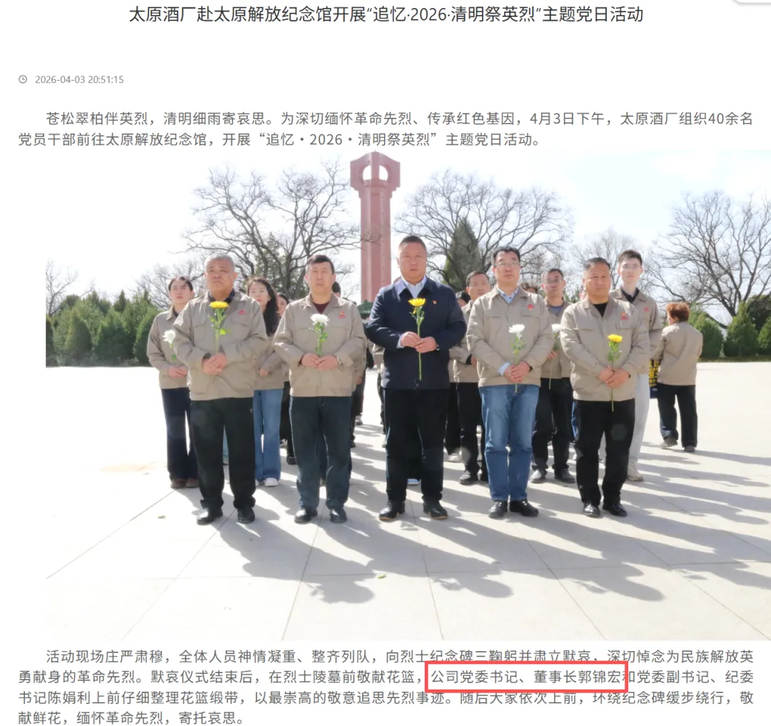 4月3日晚,在太原酒厂官网发布的最新一篇文章中,提及在3日下午,太原酒厂组织40余名党员干部前往太原解放纪念馆,开展相关活动,公司党委书记、董事长郭锦宏参加并发表讲话。