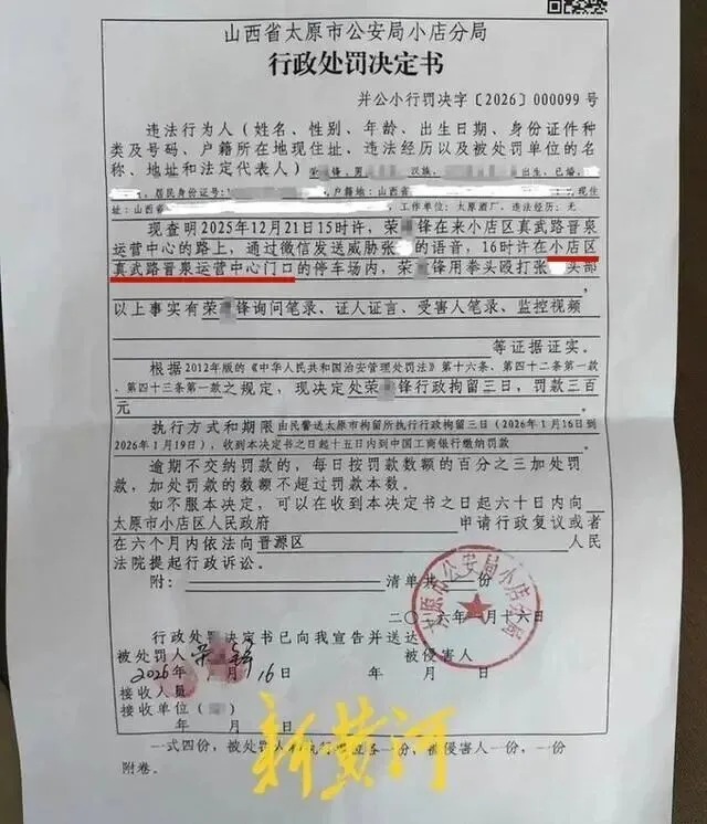 此后太原市公安局小店分局对荣某锋作出行政处罚决定书,决定对荣某锋行政拘留3日,罚款300元。