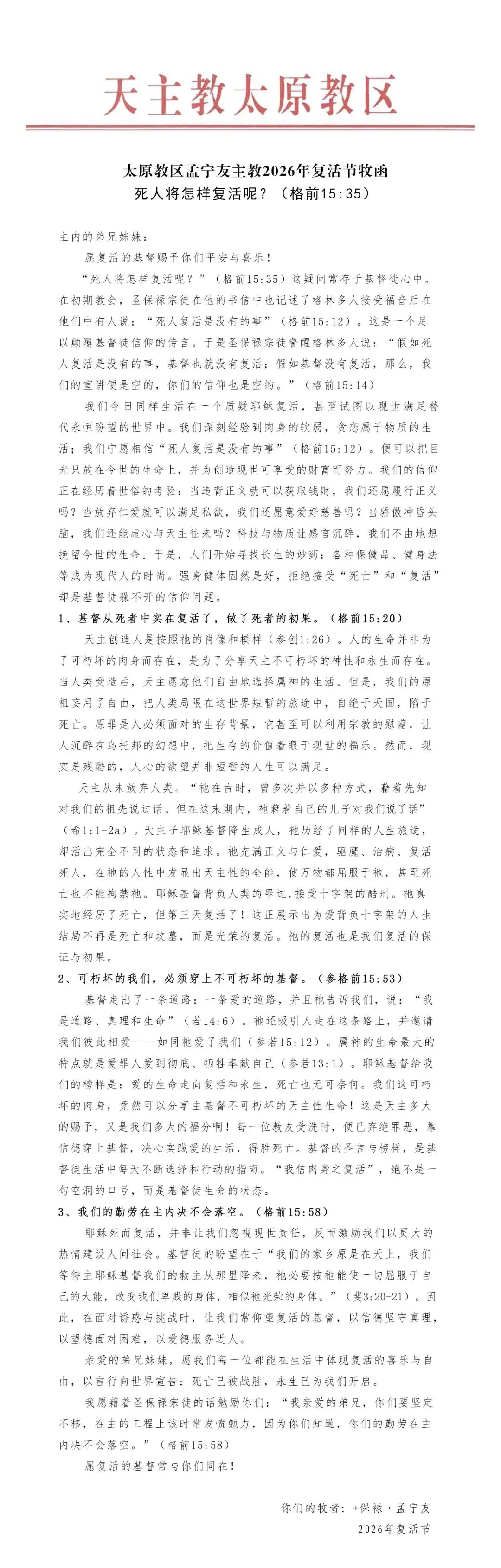【复活节牧函】太原教区孟宁友主教2026年复活节牧函