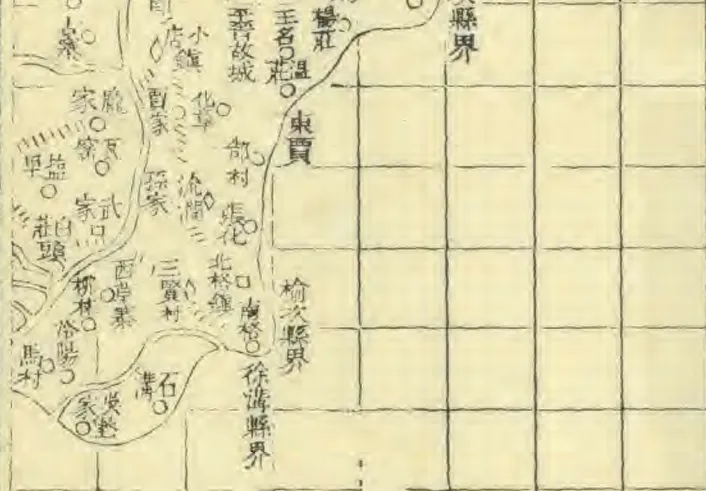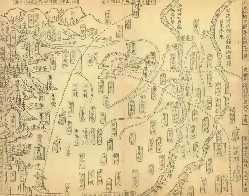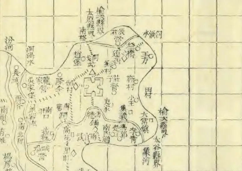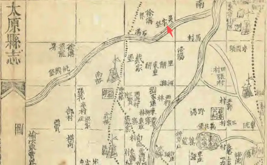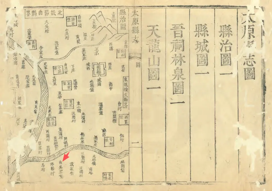 这是1731年《太原县志》里面的县域图,在它的边缘洞涡河南岸可以看到一字排开的马村、洛阳村、南吴家堡、戴家堡、石沟村等,这大约是第一次被标注。