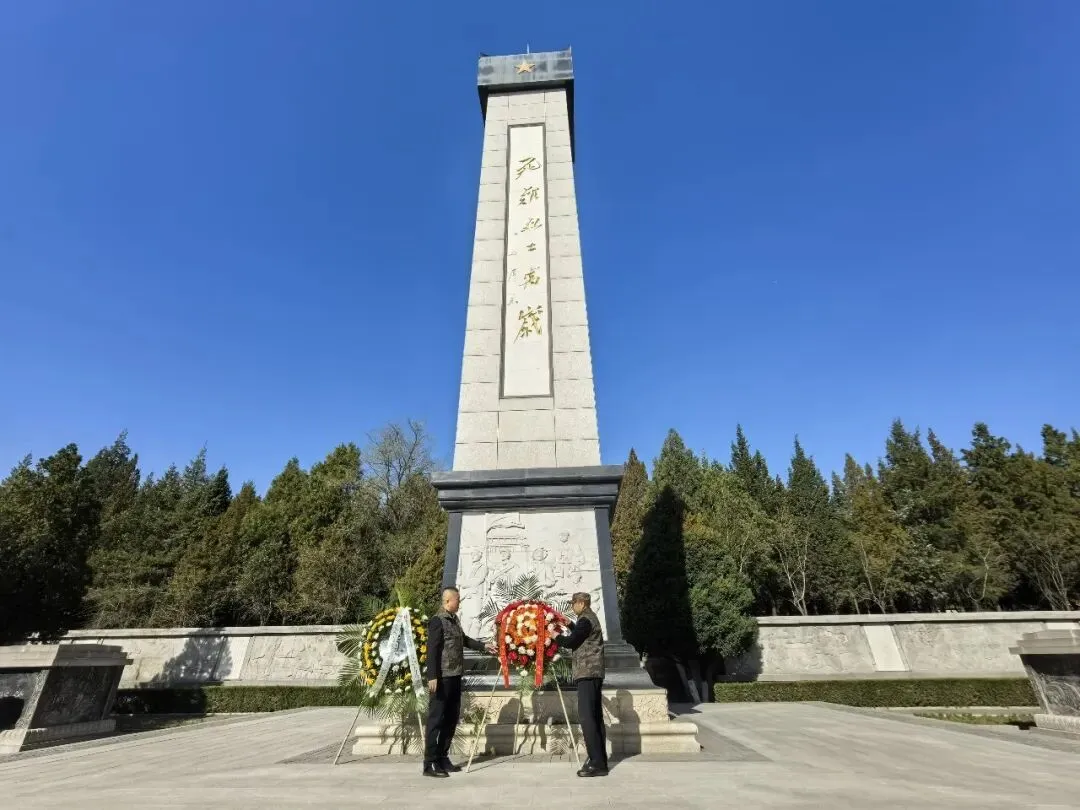 默哀结束后,活动进入第二项议程——向烈士纪念碑敬献花圈。两名礼兵迈着整齐划一的步伐,缓缓走向烈士纪念碑,将寄托着全体人员哀思与敬意的花圈稳稳摆放在碑前。花圈上的缎带熠熠生辉,“革命烈士永垂不朽”八个大字格外醒目,承载着大家对英烈的深切缅怀与崇高敬意。