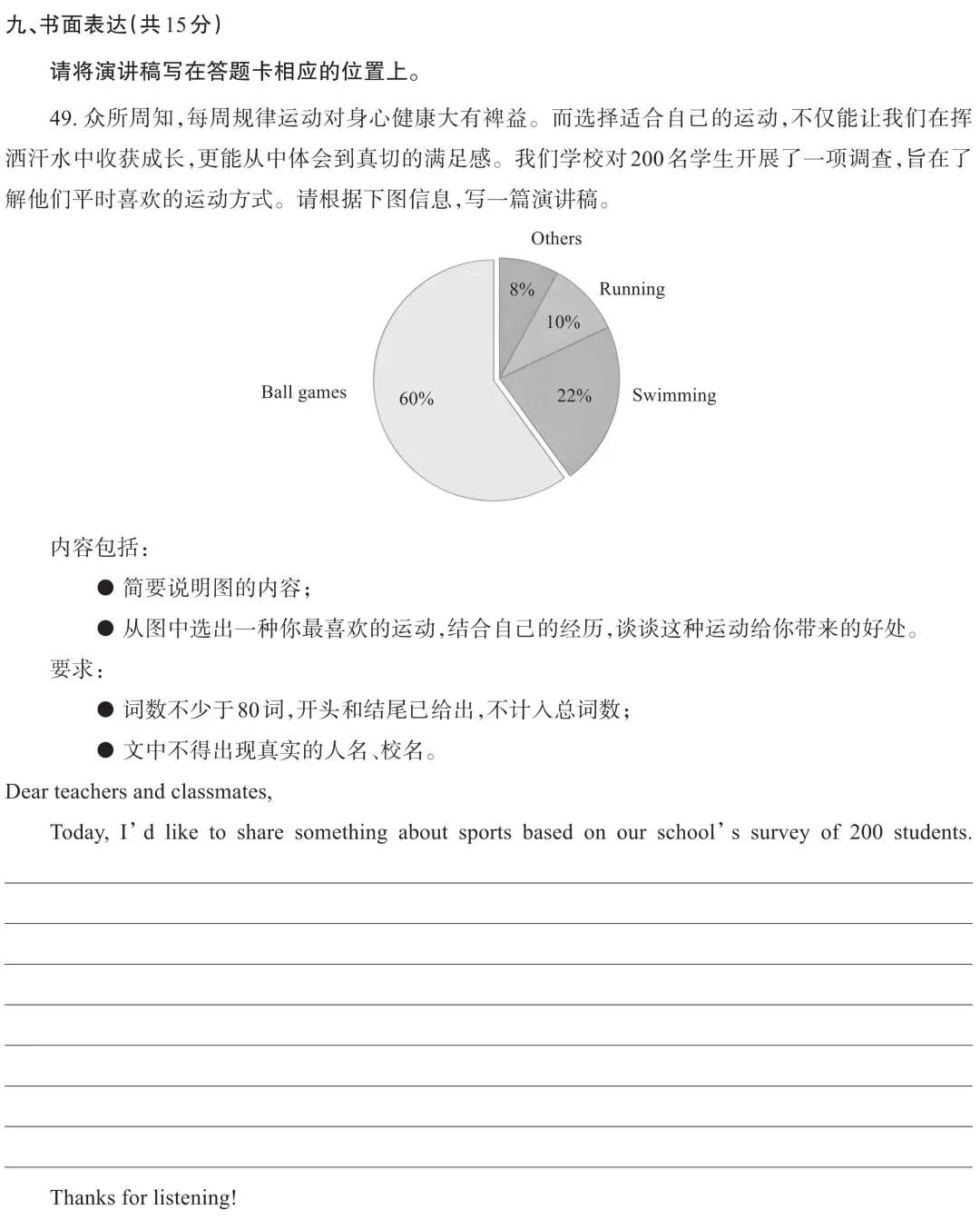 Today, I’d like to share something about sports based on our school’s survey of 200 students. According to the chart, ball games are the most popular, with 60% of the students choosing them. Swimming comes next, accounting for 22%, followed by running at 8%, while other sports make up 10%.