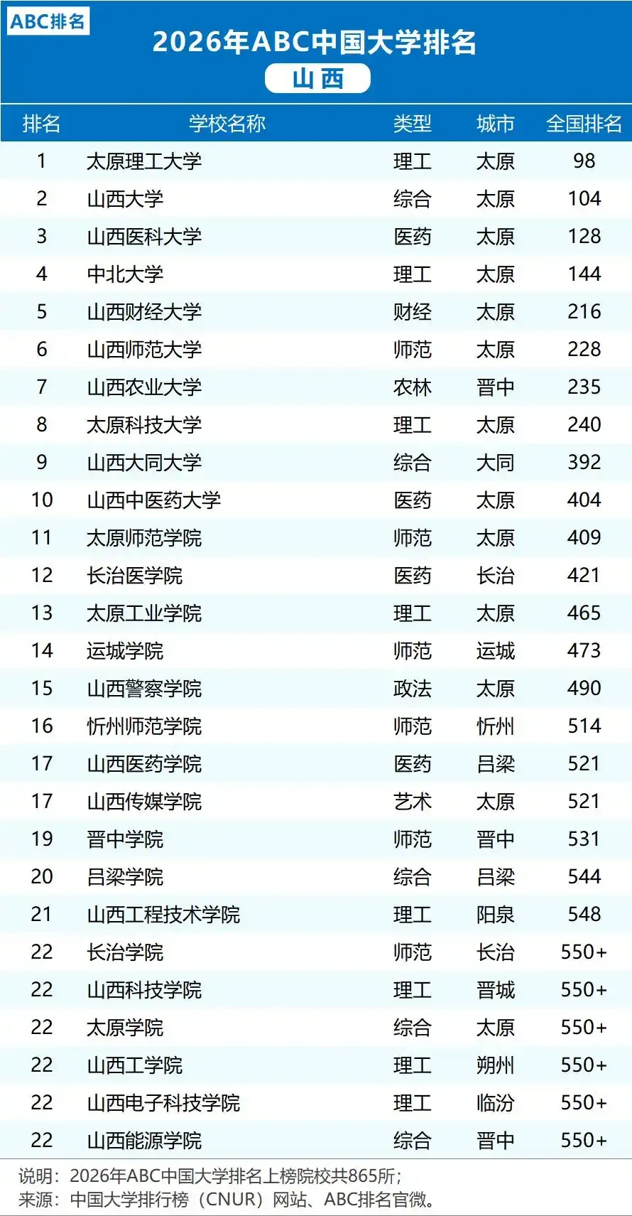 2026年山西高校排名有新的变化,最新的排名又引起了人们对本省高等教育的重视。每一个排名的更新都不是简单的数字变化,它或多或少地反映出省内各个大学在发展、竞争中出现的新情况。今天主要研究其中几所备受关注的学校。