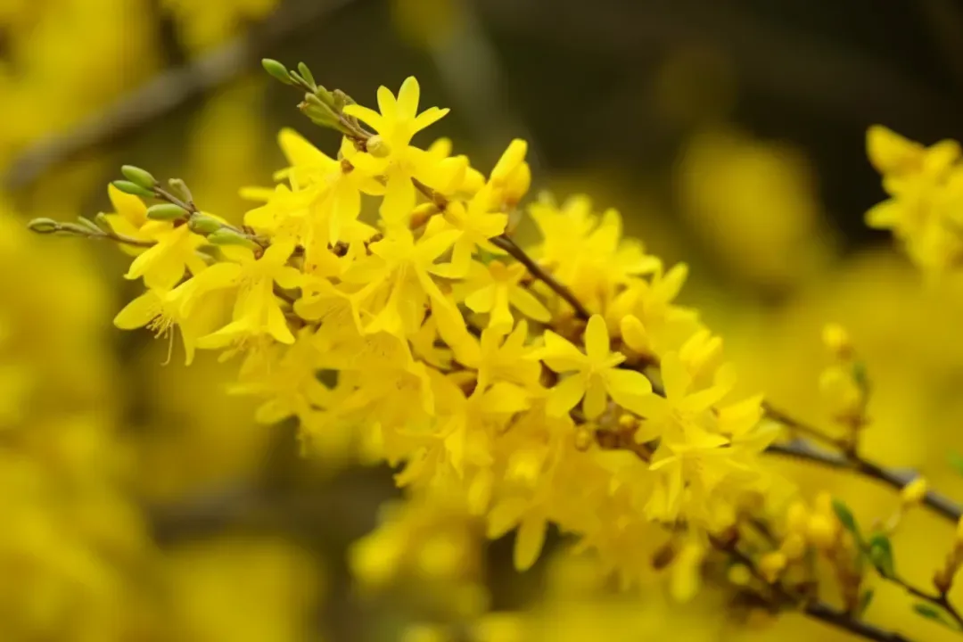连翘:“千步连翘不染尘,降香懒画蛾眉春”。连翘为落叶灌木,小花四瓣,因形态如古代的连车和翘车,故得此名。早春先叶开花,且花期长、花量多,盛开时满枝金黄,芬芳四溢。