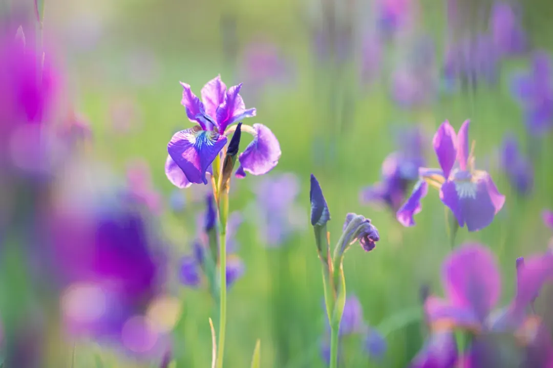 鸢尾:“紫蝶栖碧剑,星河落人间”。鸢尾花因花瓣形如鸢鸟尾巴而得名,是一种由三片萼片、三片花瓣构成的花朵。在春夏季盛开时花朵蓝紫色,淡雅清香,花形优美大而奇特,宛若翩翩彩蝶。