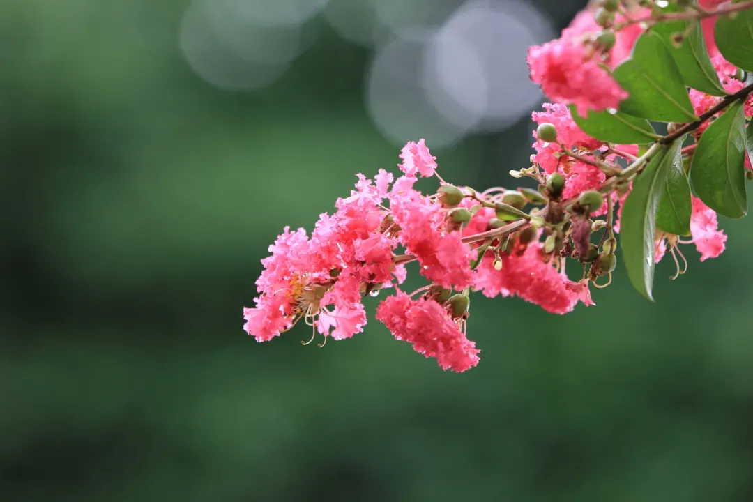 紫薇:“一丛暗淡将何比,浅碧笼裙衬紫巾”。紫薇树形优美,枝干多扭曲,古雅珍奇;花色丰富艳丽,花朵繁密,开花时正当夏秋少花季节,花期长,故有“百日红”之称。