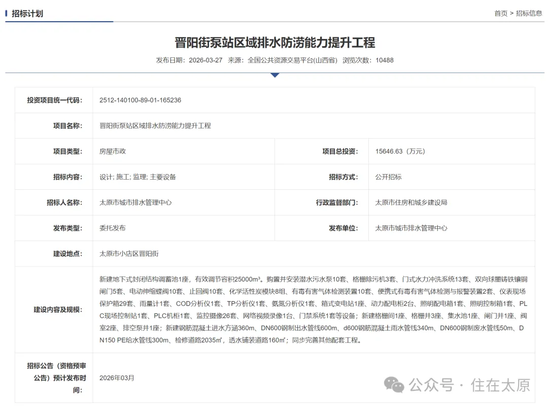 今年3月27日,太原市官方发布了“晋阳街泵站区域排水防涝能力提升工程”的招标计划。