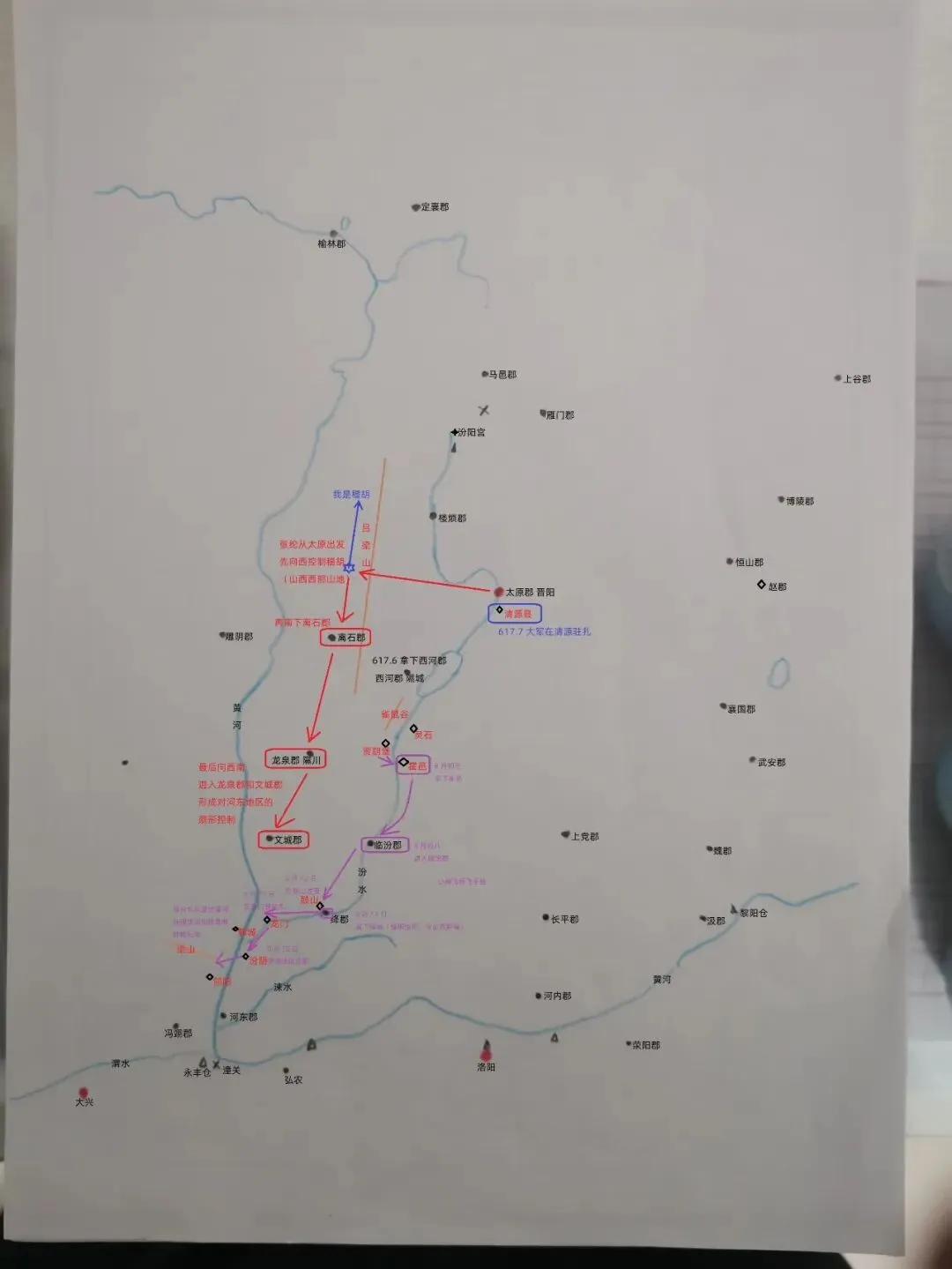 8月18日李渊行至汾阴,8月21日李渊在壶口扎营,紧接着8月24日孙华从郃阳赶来接应李渊渡河。(图1左下紫色)