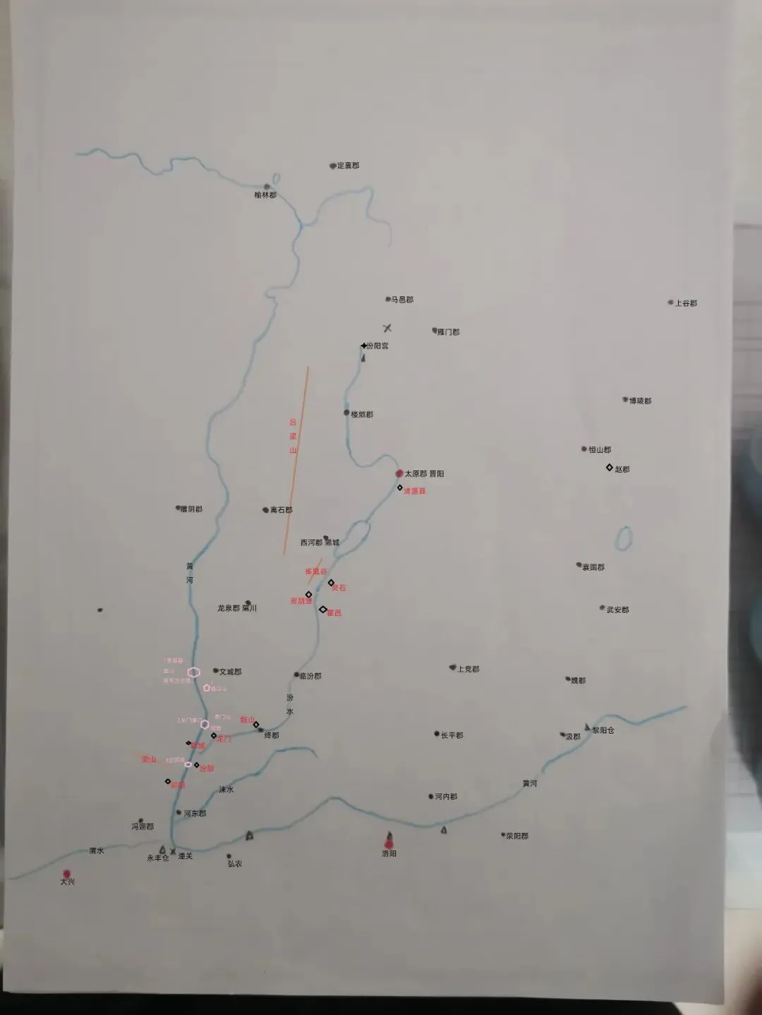 标注1:地图上的“壶口山”:文城郡郡治西南有一处标注为“壶口山”。