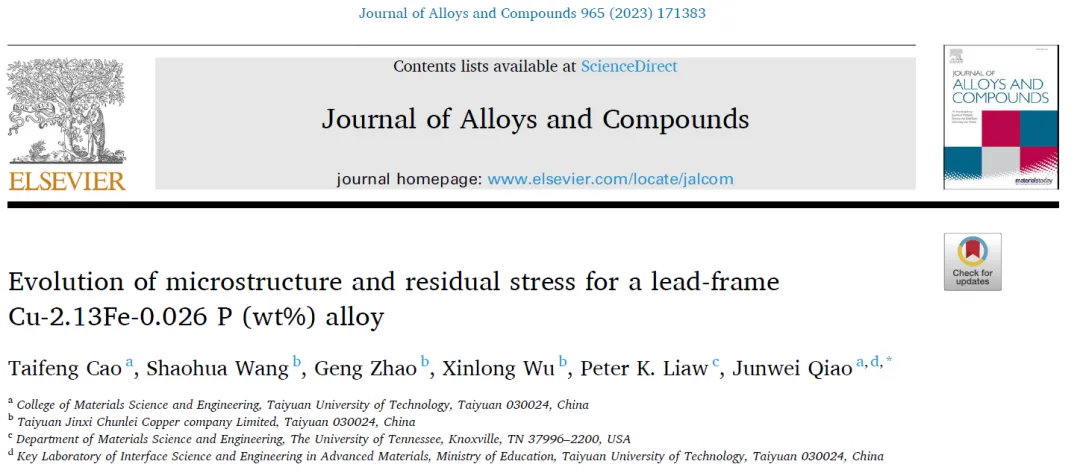 太原理工大学 Journal of Alloys and Compounds 冷轧与退火过程中 Cu-Fe-P 合金残余应力的演变规律及其微观机制
