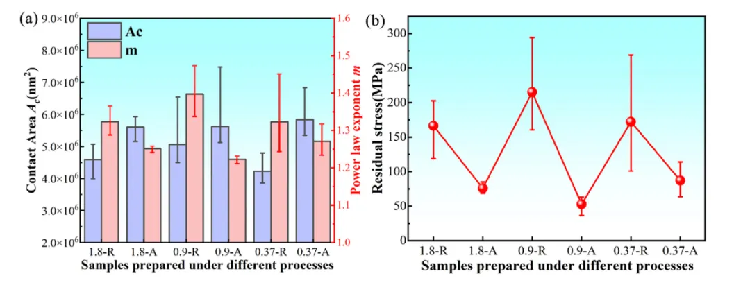 图1 不同样品的纳米压痕测试结果。(a)不同样品的接触面积 Ac 与卸载曲线幂律指数 m;(b)不同样品的残余应力值。