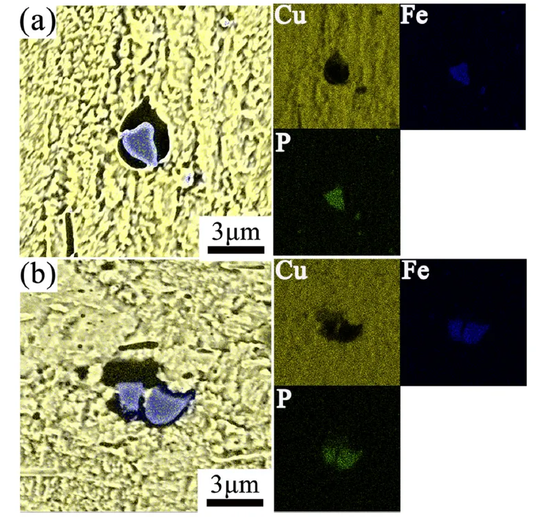 图4 能谱仪检测到的轧态与退火态样品中的 Fe3P 颗粒。(a)0.9-R;(b)0.9-A。