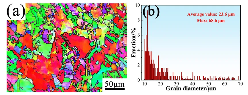 图5 电子背散射衍射检测得到的初始态样品微观结构。(a)反极图;(b)晶粒尺寸分布图。