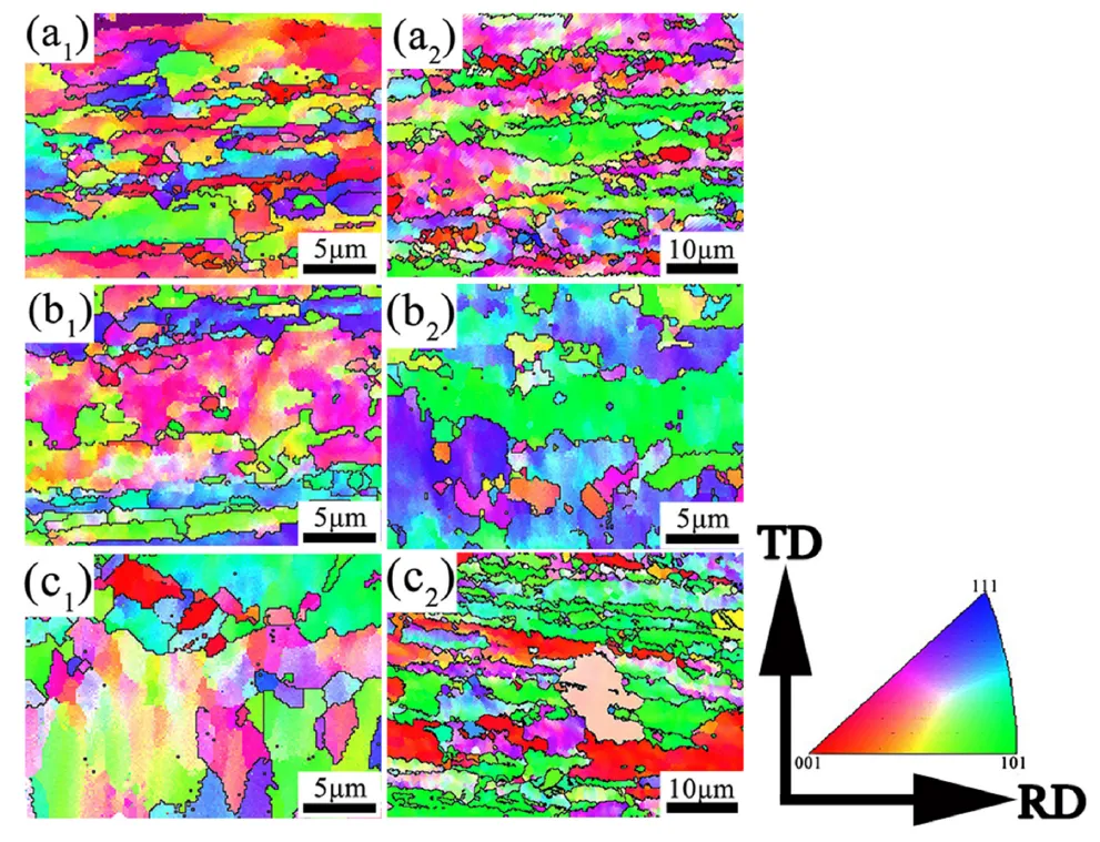 图6 电子背散射衍射检测得到的轧态与退火态样品晶粒取向分布。(a1)1.8-R;(a2)1.8-A;(b1)0.9-R;(b2)0.9-A;(c1)0.37-R;(c2)0.37-A。