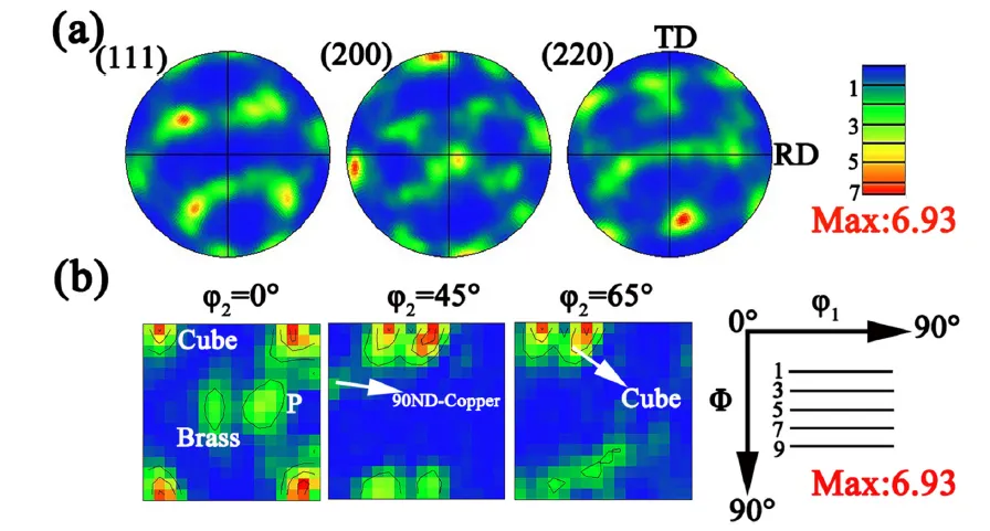 图7 电子背散射衍射检测得到的初始态样品织构分布。(a){111}、{200} 和 {220} 晶面的极图;(b)φ2 = 0°、45° 和 65° 的取向分布函数图。