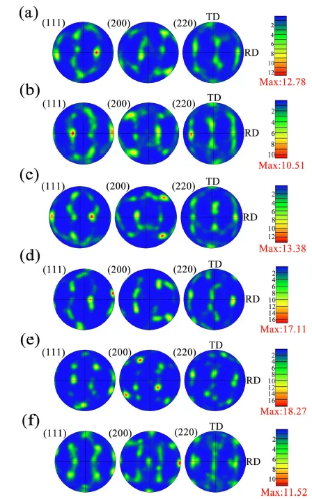 图8 轧态与退火态样品在 {111}、{200} 和 {220} 晶面上的极图。(a)1.8-R;(b)1.8-A;(c)0.9-R;(d)0.9-A;(e)0.37-R;(f)0.37-A。