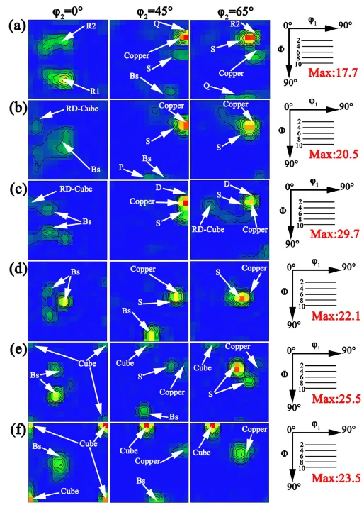 图9 轧态与退火态样品在 φ2 = 0°、45° 和 65° 截面上的取向分布函数图。(a)1.8-R;(b)1.8-A;(c)0.9-R;(d)0.9-A;(e)0.37-R;(f)0.37-A。