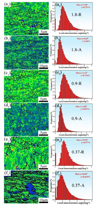 图11 电子背散射衍射测量得到的轧态与退火态样品的核平均取向差图。(a1)至(f1)应变分布图;(a2)至(f2)核平均取向差图,分别对应 1.8-R、1.8-A、0.9-R、0.9-A、0.37-R 和 0.37-A。