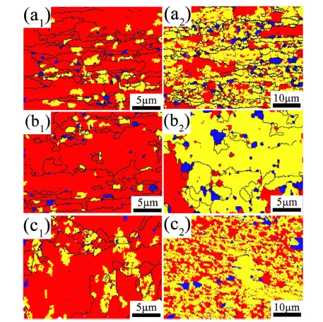 图12 电子背散射衍射测量得到的轧态与退火态样品的再结晶分数图。(a1)1.8-R;(a2)1.8-A;(b1)0.9-R;(b2)0.9-A;(c1)0.37-R;(c2)0.37-A。