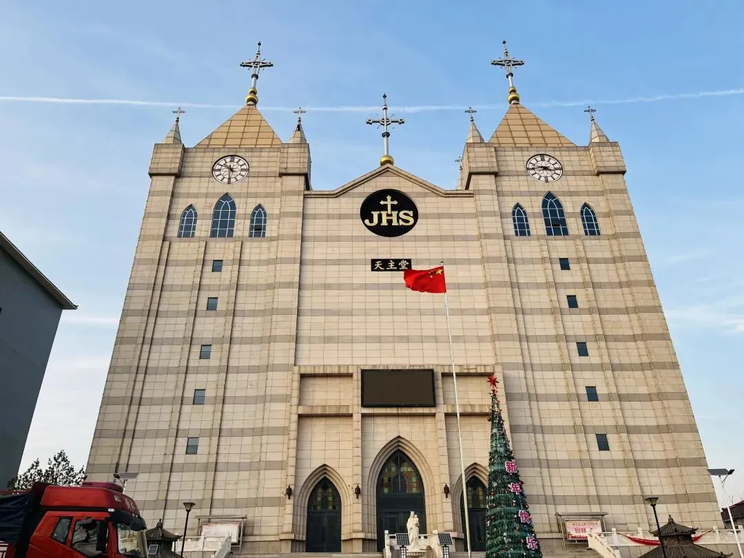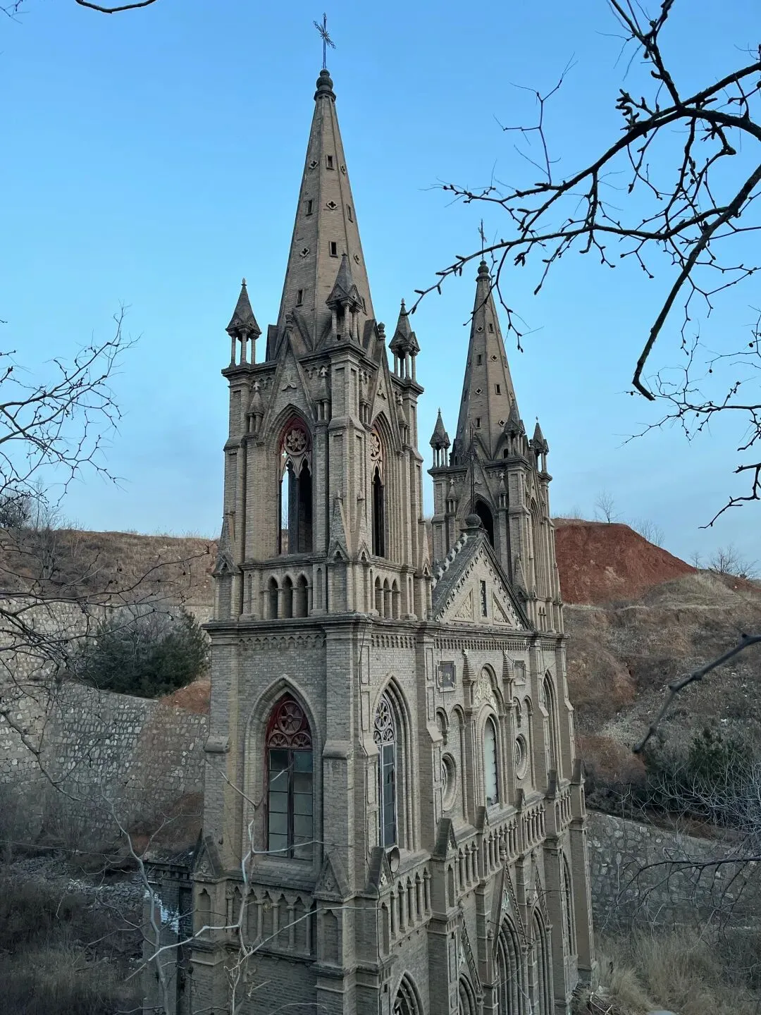 教堂原名“耶稣圣心堂”,由意大利方济各会士艾士杰于1921年设计并主持修建,现在已经一百多年的历史了,属于典型的哥特式建筑,采用精美的砖石结构。堂身长六间,宽三间,坐北朝南。近处仰视尖塔直插云霄,犹如双峰兀立的大山,充满向上升腾的动势。