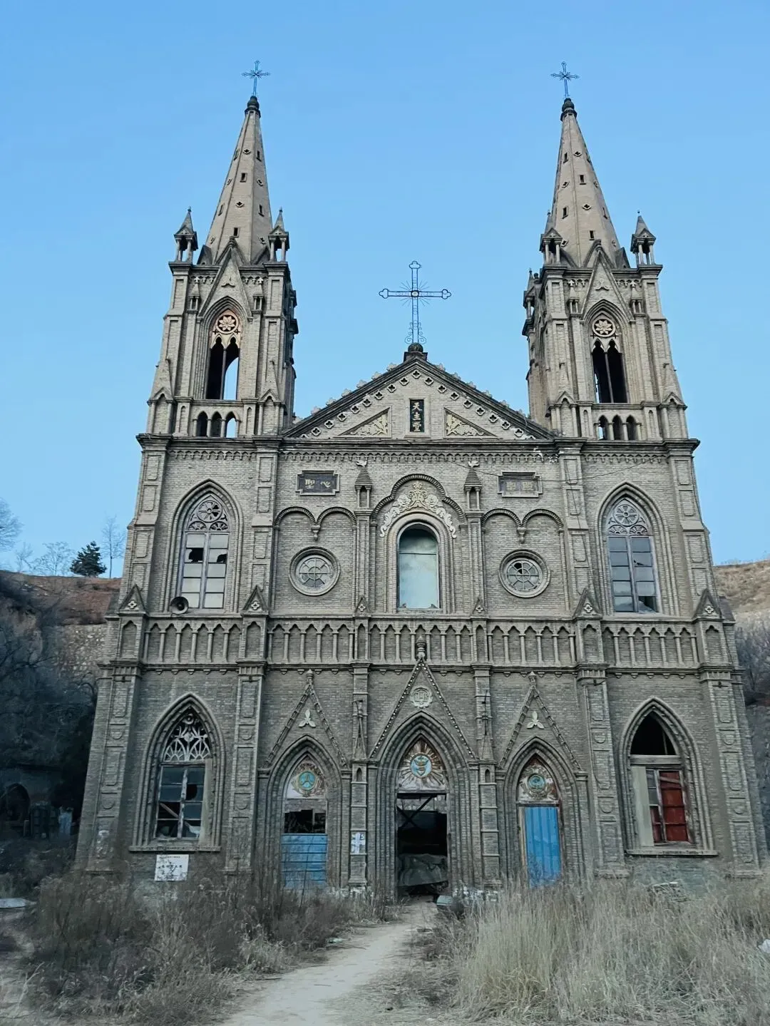 如今的它,已是“半座教堂”。支撑柱上巨大的裂缝像时间的伤痕,顶部的卯鞘全部裂开,后部已经在泥水的浸泡中坍塌,双塔依旧伫立,精美、威严。哥特式的尖形拱门也在,半圆拱形的窗框线条流畅,雕纹繁复——即便残破至此,依然能看出当年的精美与考究。