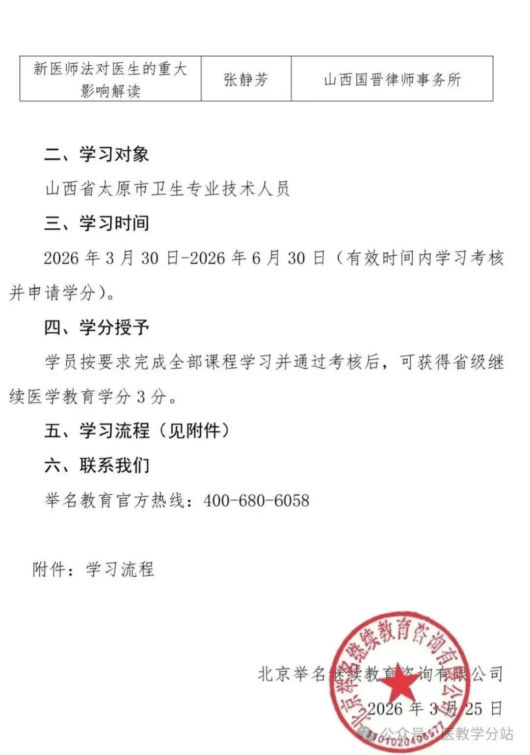 为助力医疗工作者精准把握行业法律边界、规避执业风险,规范执业行为,提升风险防范能力,为医疗行业合规发展筑牢法治基础,举名继续教育网特面向山西省太原市卫生专业技术人员精心打造并开展本次继续医学教育公益项目,现就有关事项通知如下: