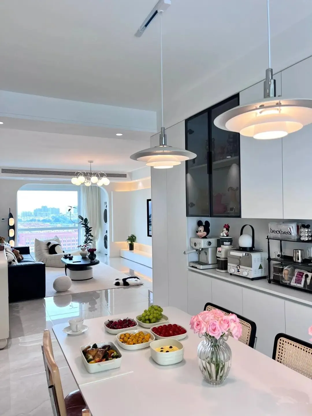 此外,奶油中古风还非常符合年轻人的“社交属性”。开放式的客餐厨一体化设计,搭配一张超大的岛台餐桌,这里既是厨房,也是餐厅,更是家庭酒吧和办公区。朋友来聚会,大家围坐在一起煮咖啡、做烘焙、看电影,这种轻松自在的社交氛围,正是年轻人最向往的生活方式。