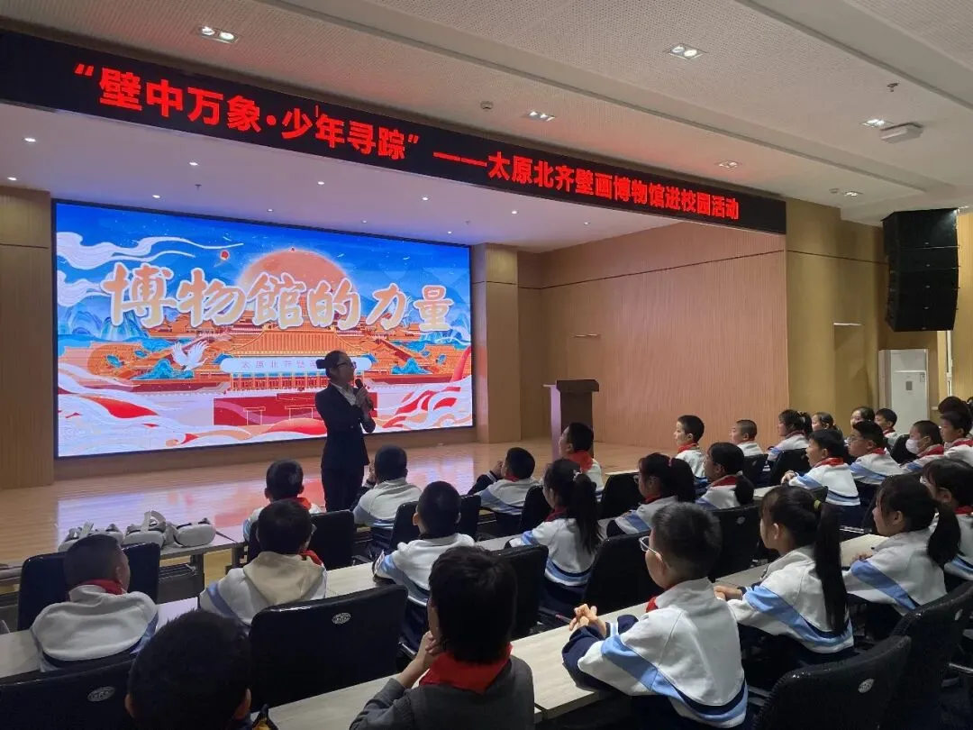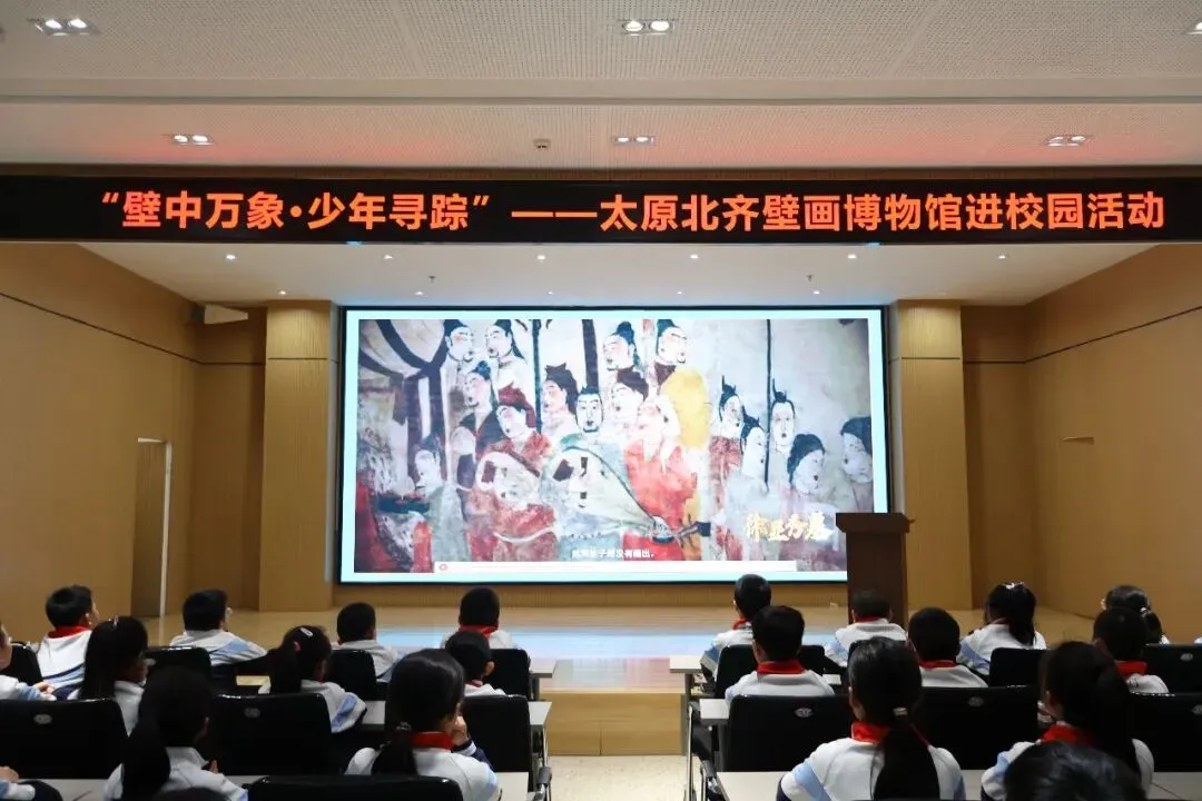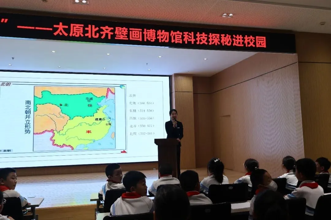 致辞结束后,太原北齐壁画博物馆讲解员侯悦化身“历史说书人”,为同学们带来生动的专题讲座。她以幽默风趣的语言,详细拆解北齐壁画的历史背景、艺术特色,重点解读徐显秀墓壁画的珍贵价值,以及文物保护背后的科学奥秘。