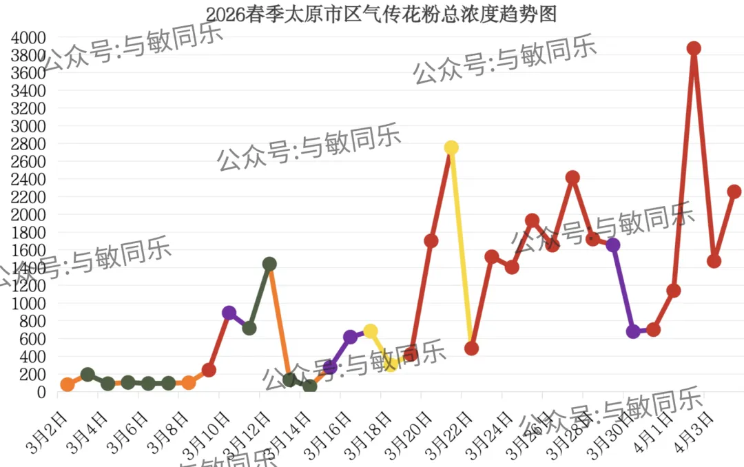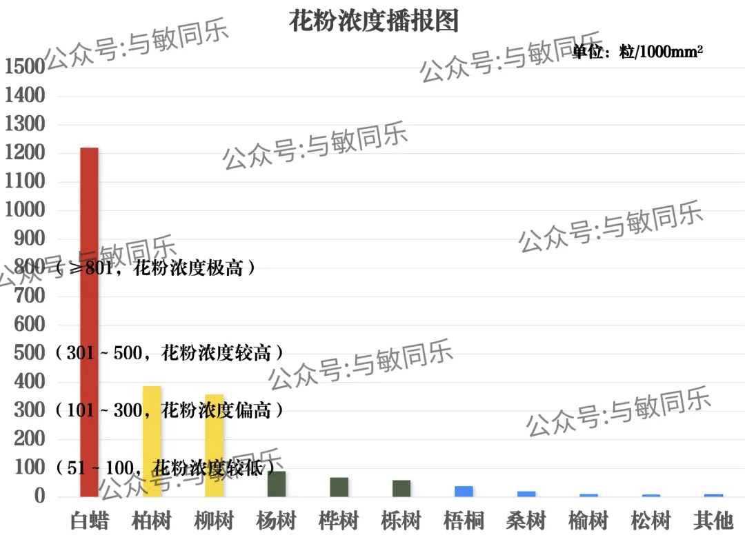 4月4日早8点至4月5日早8点:花粉总数≥801(粒/1000mm²),花粉总浓度为六级(花粉浓度极高)。