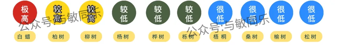 气传致敏花粉种类包括:白蜡、柏树、柳树、杨树、桦树、栎树、梧桐、桑树、榆树、松树等;