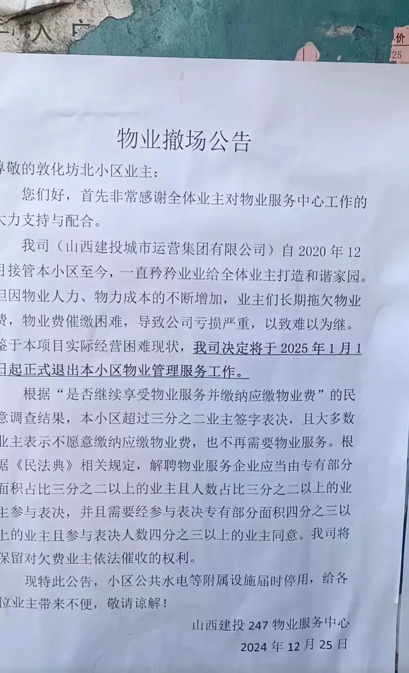 还有的小区,物业坦言成本高、收费率低、长期亏损,实在撑不下去,只能选择主动退出,甚至提前发布公告,停止部分公共服务。