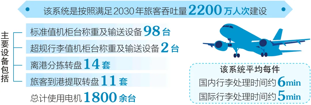 这套行李处理系统是按照满足2030年旅客吞吐量2200万人次建设的,主要设备包括标准值机柜台称重及输送设备98台,超规行李值机柜台称重及输送设备2台,离港分拣转盘14套,旅客到港提取转盘11套,总计使用电机1800余台。同时该系统预留远期行李系统扩展接口,扩建后可满足远期规划2035年3200万人次旅客吞吐量需求。