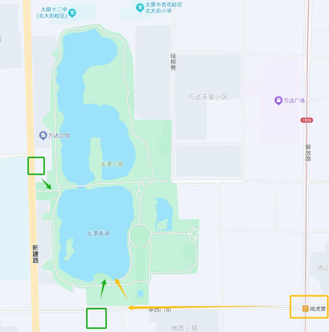 🚇地铁党:乘坐太原地铁2号线至【缉虎营】B口出,向西步行可到达公园南门。
