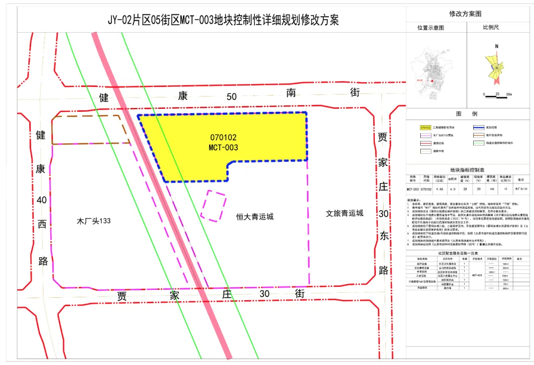 4月2日,太原市规划和自然资源局网站发布了《JY-02片区05街区MCT-003等地块控制性详细规划修改方案》。JY-02片区05街区MCT-003等地块位于晋阳湖东岸,为晋源区木厂头城中村改造用地,面积4.66公顷(约70亩),容积率4.0,建筑密度28%,绿地率20%,建筑高度100米,原规划(2024年1月(第013号公示))用地性质为B1/B2 商业商务混合用地(商业 + 办公),此次调整为二类城镇住宅用地。JY-02片区05街区MCT-003地块规划修改,涉及的城中村是太原市晋源区金胜镇木厂头村。值得一提的是,在此次《控制性详细规划修改方案》中,规划要求第6条提到:规划地块位于轨道交通6号线轨道控制保护区……地铁6号线对太原文旅产业的促进作用十分显著,也是被市民最关注的轨道线路之一。