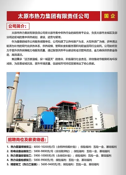 对于山西冶金技师学院的毕业生而言,太原热力集团提供了广阔的就业空间与稳定的职业发展路径。公司长期招聘热力管道安装工、设备检修技工、机电运维员、焊工、钳工等技术岗位,高度契合学院毕业生的专业技能方向。入职后,可享受国企标准的薪酬福利体系,月薪范围广泛,技术骨干岗位可达8000元以上,并享有五险一金、带薪培训、节日福利及职业晋升通道。