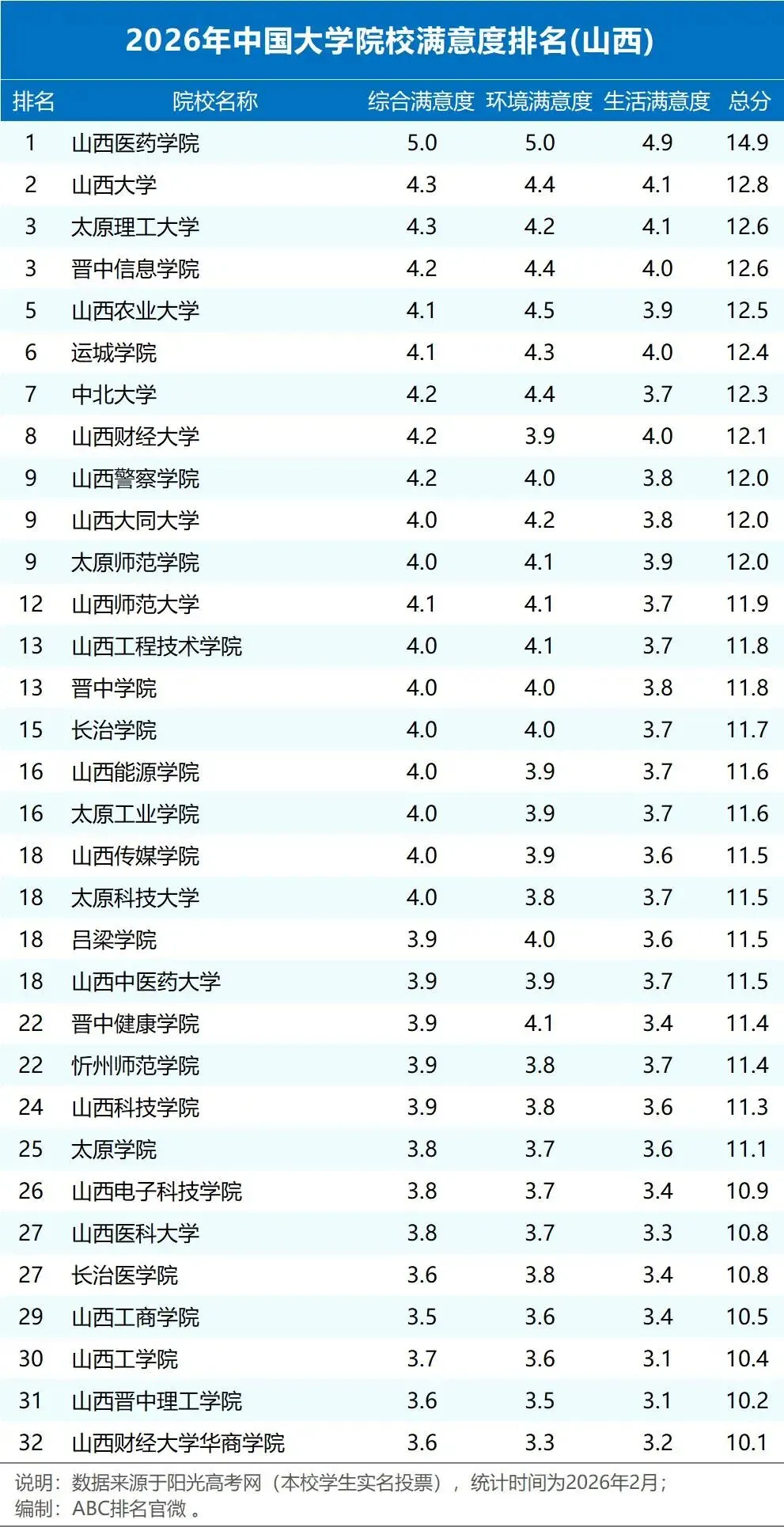 今天,来看看2026年山西省大学院校满意度的排名情况。