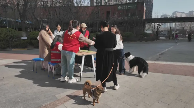 在万科城小区广场,社区工作人员专门设立了宣传服务点,现场为养犬居民办理信息登记,并发放文明养犬宣传页。