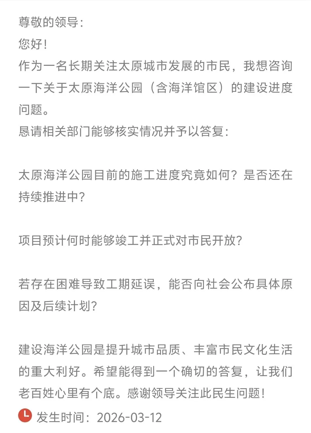 在这则留言中,市民表示,作为一名长期关注太原城市发展的市民,十分关心太原海洋公园的建设情况。他指出,海洋公园的建设不仅有助于提升城市品质,也能丰富市民的文化生活,是一项重大民生利好。