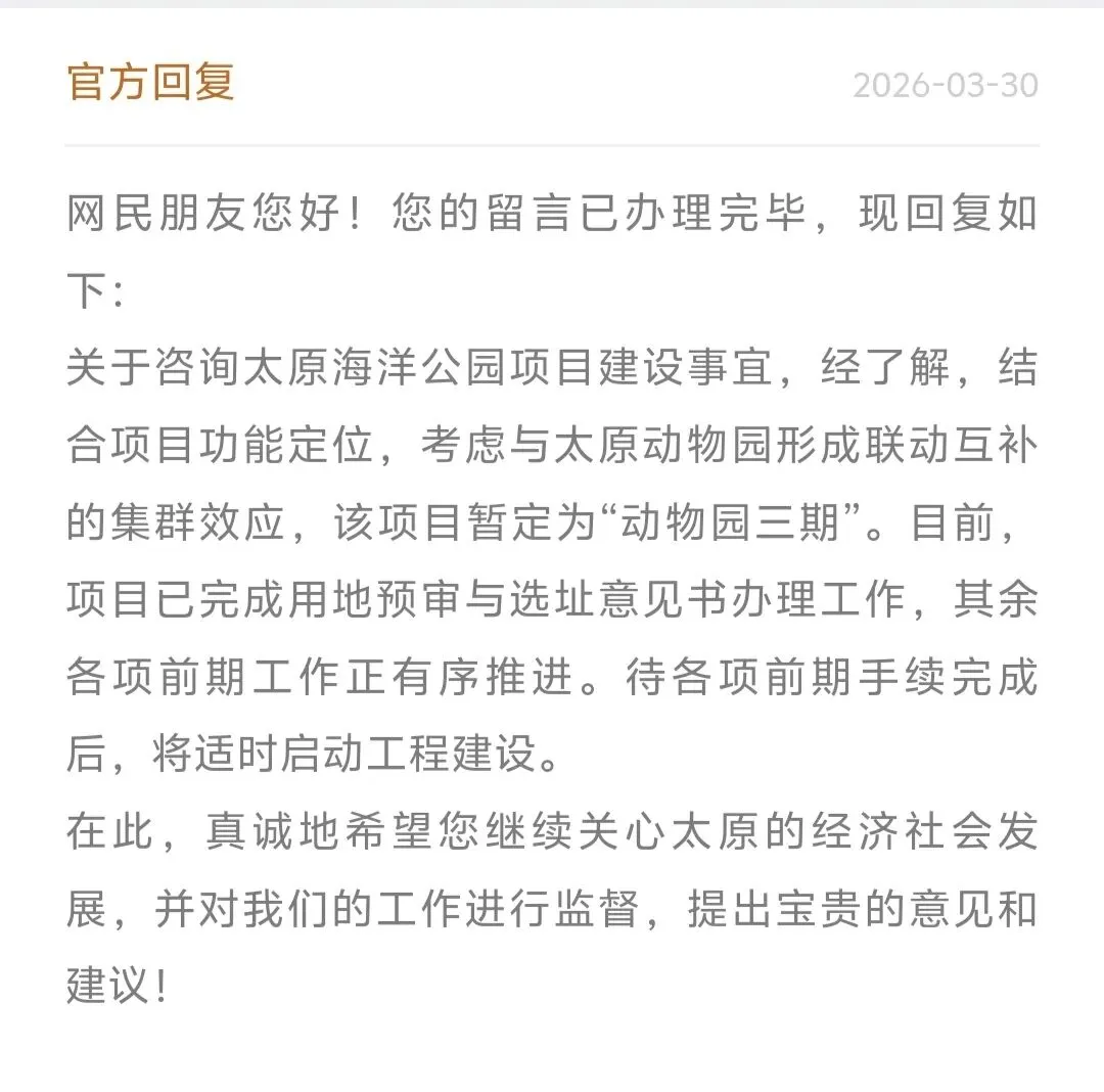 “关于咨询太原海洋公园项目建设事宜,经了解,结合项目功能定位,考虑与太原动物园形成联动互补的集群效应,该项目暂定为‘动物园三期’。目前,项目已完成用地预审与选址意见书办理工作,其余各项前期工作正有序推进。待各项前期手续完成后,将适时启动工程建设。”