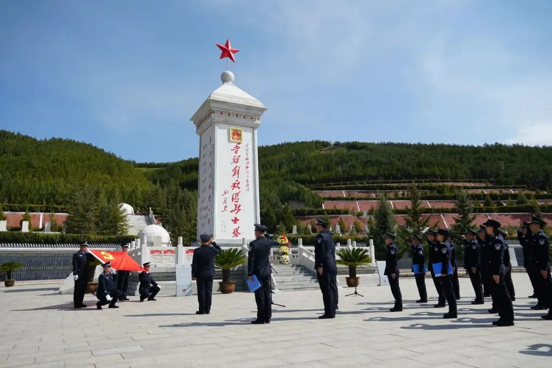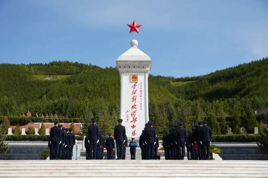 晋绥解放区烈士塔前,全体干部民警警容严整、精神肃穆。在雄壮嘹亮的《中华人民共和国国歌》歌声中正式开始。