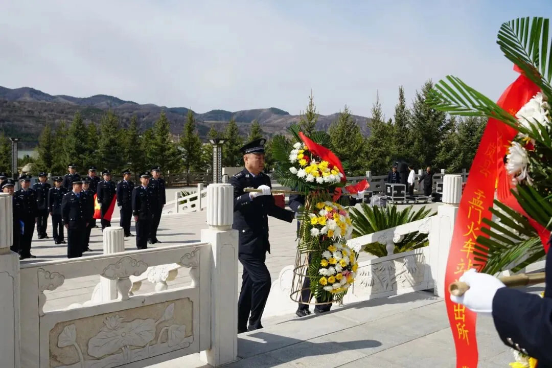 国歌唱毕,全场肃立,全体干部民警向英烈低头默哀,表达对先辈英烈的崇高敬意与深切缅怀。默哀毕,民警代表缓步上前,向英烈敬献花篮,松柏不语,丰碑永存。